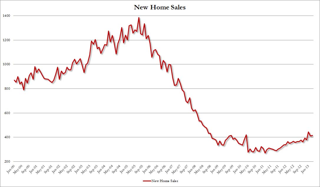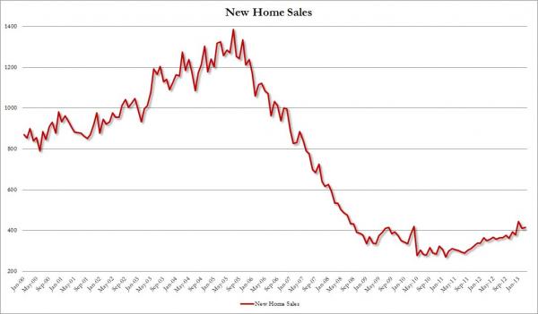 It is only logical that after last month’s New Home Sales miss (exp. 420, printed 411K), which sent the market higher, today’s tiniest of beats in New Home Sales, which printed at 417K, on expectations of 416K, would also send the market higher. The total months of supply indicated was 4.4, the same as February, and well above the 4.0 from January. Unnoticed in the release was that the January housing data was revised higher from 431K to 445K, meaning last month’s drop would have been even more acute (-7.6% instead of -4.6%), but who cares about such things as data chronology now that the headline effect is long gone. All that matters is that the trend is the mainstream media’s friend, which can report new home sales have grown once more… if only back to levels last seen in April of 2010 when the same number was 422K. Was the data actually meaningful on a long-term basis? We will let readers decide on their own after one look at the chart below.